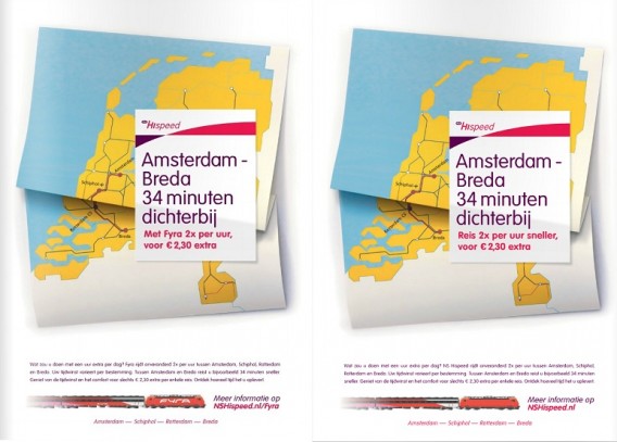 De NS noemt de Fyra niet meer in de advertenties van de hogesnelheidslijnen. In een advertentie van vrijdag stond nog dat Fyra onveranderd twee keer per dag rijdt tussen Amsterdam, Schiphol, Rotterdam en Breda. Maar vanaf maandag heeft NS HiSpeed de merknaam laten vallen uit de advertentie.