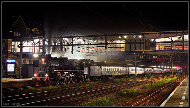 Een SSN-stoomtrein die in de avond een korte stop maakt op station Woerden.