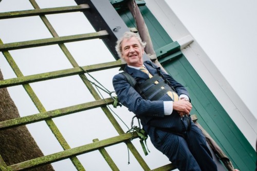 Vanaf 1 januari 2017 zullen de treinen van NS voor 100 procent op groene windenergie rijden. Om te demonstreren hoe krachtig windenergie eigenlijk is, liet NS-topman Roger van Boxtel zich vastsnoeren aan een molenwiek om een rondje over de kop te gaan.