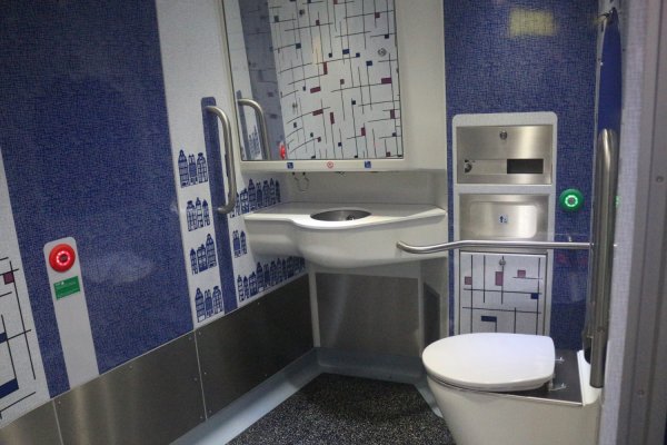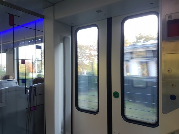 Deze foto is eerder geschoten tijdens een bezoek aan de werkplaats. Dit is het balkon waar plaats is voor rolstoelen en waar ook een rolstoelvriendelijk toilet te vinden is. De instaptreden bij de deuren van dit rijtuig schuiven verder uit dan die van de andere rijtuigen..
