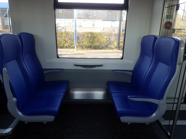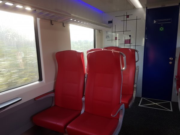 De stoelen in de tweede klas zijn blauw van kleur. Hierbij is duidelijk te zien dat bij de bakovergang de stoielen hoger zijn geplaatst vanwege het jacobsdraaistel wat onder de trein is geplaatst.