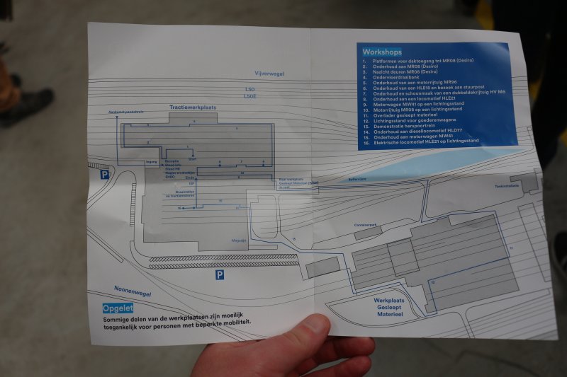 Aangekomen op het terrein begon er een rondleiding met een speciale looproute waarmee je ongeveer twee uur zoet mee was. Zo begon je vanaf de de feestelijk ingerichte hal met een bezoek aan de onderhoudssporen van de Desiro-stellen waarbij je de treinen van zowel onder als boven kon bekijken. Daarna volgende er een hele tour over het complex waarbij elk soort materieel te bewonderen was. Blauwe informatieborden gaven tekst en uitleg over het te bezichtigen materieel of de werkwijzen van de technische apparatuur van de werkplaats.