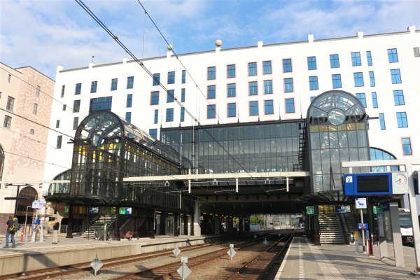 Buiten het station heb je een mooi overzicht op een groot plein, hieronder ligt het spoor.