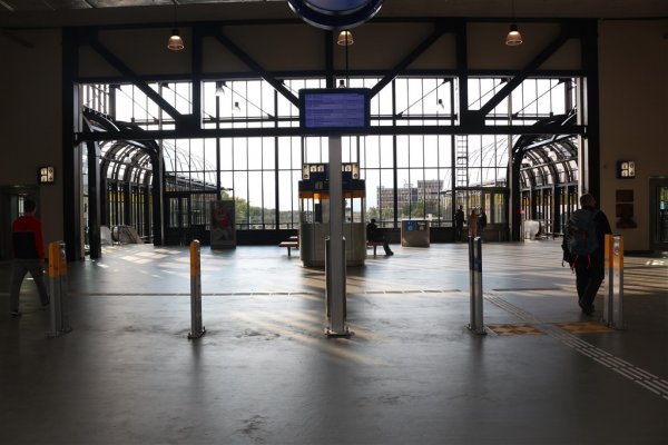 De ingang van het stationsgebouw. Hier zijn gene poortjes aangebracht maar zuiltjes, om mee in te checken.
