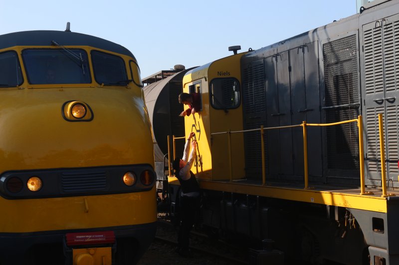 In Opperdoes lieten de vrijwilligers van de 2454 crew een mooi staaltje vakmanschap zien door heen en weer te rangeren met de 151 en de beladen 2454 locomotief. De goederentrein reed het station voorbij, en de 151 met alle deelnemers konden op het station uitstappen om via de naastgelegen overweg door te lopen naar de overzijde van het spoor. Hier begon het rangeerfestijn waarbij de Plan U het zijspoor op reed, waarna de 2454 op zijn beurt de goederentrein een stukje verder voor het perron sleepte. Hier werd de locomotief losgekoppeld om vervolgens naar het zijspoor te rijden. De Sik 361 die achterop liep was vervolgens aan zet om de goederentreinhet hoofdspoor op te drukken, waarna de 2454 zich weer liet zien zodat de Sik de goederentrein weer tegen de 2454 kon plaatsen, samen met de SIk er weer achteraan.