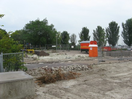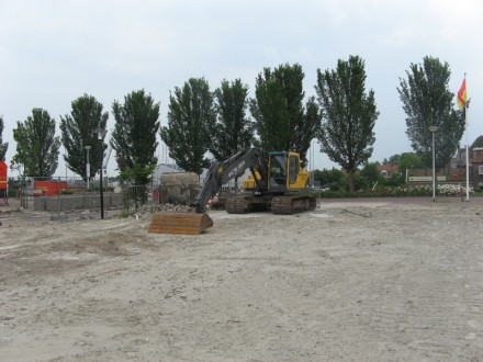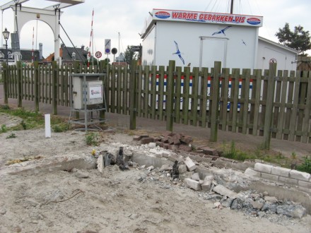 De watersport-winkel was nu volledig gesloopt tesamen met de fundering en er waren werkzaamheden begonnen om de bestrating weer op netjes neer te leggen.