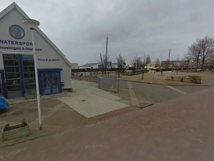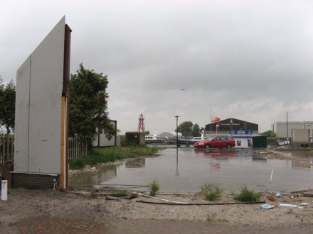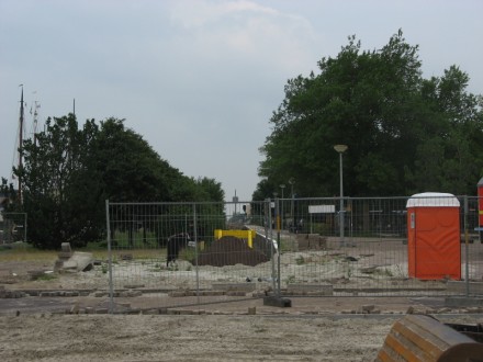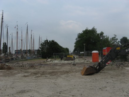 Als je de omgeving van het plein ziet is wel duidelijk dat er iets vreemds gebeurd is. De parkeerplaatsen zien er niet netjes uit daardat er klinker missen, er staat een bouwhek na het stootbloken er ligt een fundering met daarop een klein deel met wat ooit een watersportwinkel was. Er is weinig te zien van eventuele werkzaamheden.