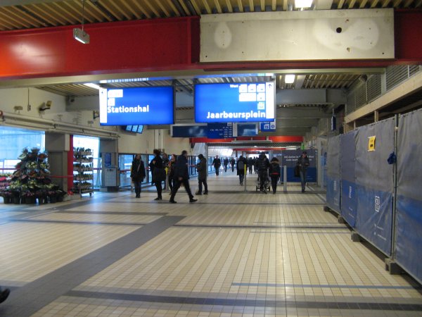 Om te beginnen kijken we naar de oude situatie. Toien werd er nog gebruik gemaakt van de smalle traverse tussen de stationshal en het Jaarbeursplein. Dit kon grote capaciteiten mensen maar nauwelijks verwerken en tevens was het in de spits een enorme drukte. Deze onderstaande foto's zijn op 2 januari gemaakt, toen de winkels en de Blokhut in de traverse inmiddels al afgesloten en deels ontmanteld waren.