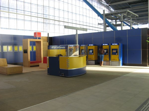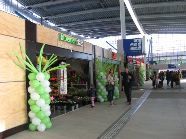 In de hal zien we aan de zijkant tegen de bouwplek waar de treaverse wordt afgebroken o.a de nieuwe en derde verhuisde bloemenzaak van Vogelpoel. Hier kunnen de reizigers bijvoorbeeld een bloemetje kopen voor hun geliefde waar ze naar toe reizen.