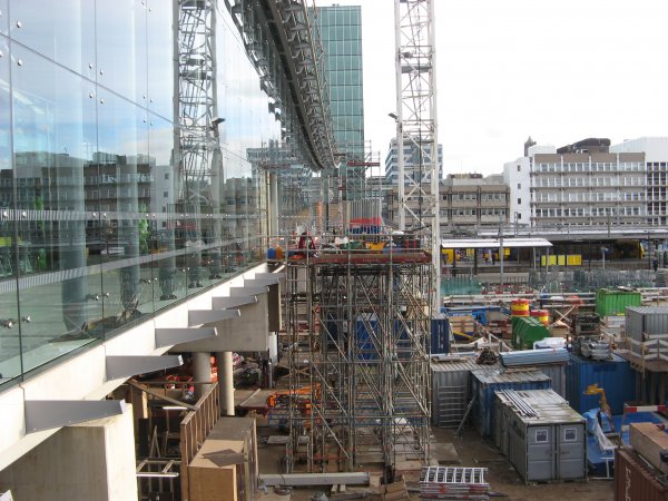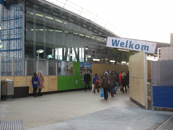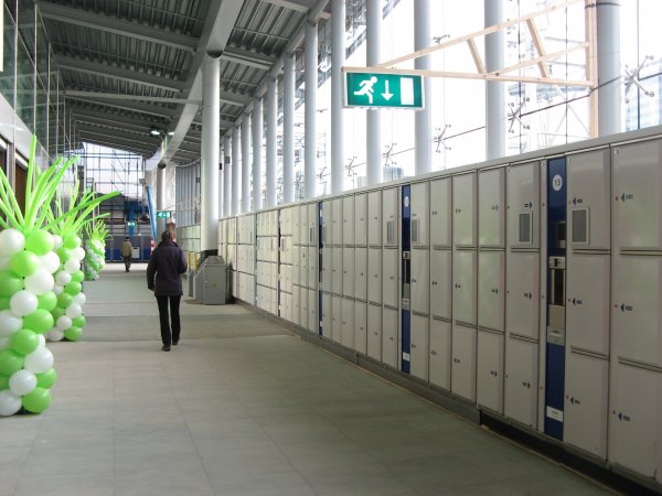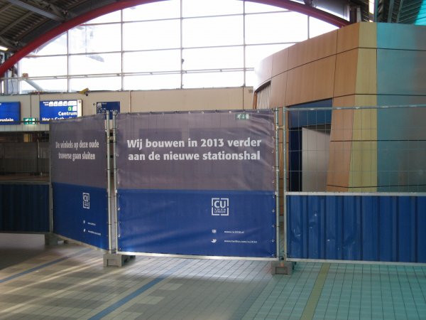 Aan de linker zijkant van het stationshal, achter de permanente winkeltjes is de definitieve plek van de stationskluizen geplaatst. in deze wanden bevinden zich ook enkele tijdelijke deuren. Deze leidden naar naar de bouwplaats beneden daar waar inmiddels hard gewerkt wordt om in 2014 de nieuwe perrons voor de sporen 20 en 21 te openen.