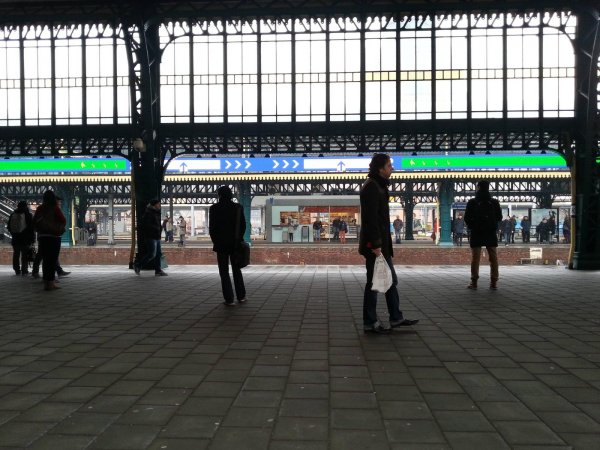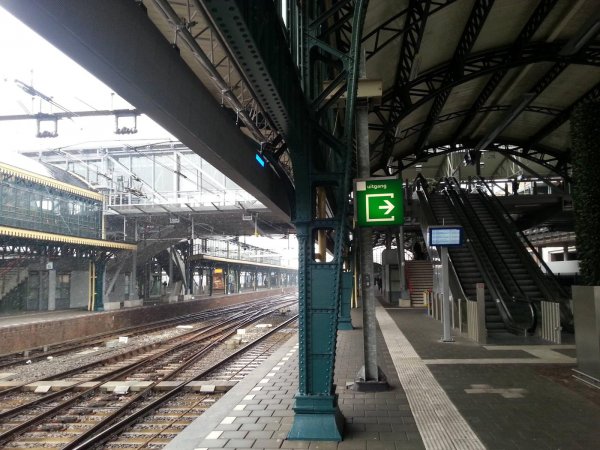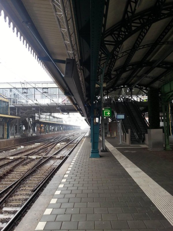 Hier zien we het perron van spoor 1 in 's Hertogenbosch. Linksboven zien we de lange balk welke normaal de instap-informatie toont. Gezien er nu geen trein onderweg is is het display ook leeg.