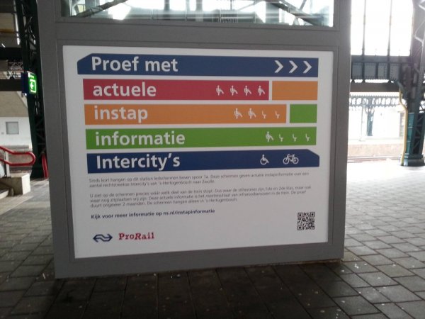 Naast dat de informatie op een 'app' te vinden is, loopt er op het station van 's Hertogenbosch ook een proef waarbij een 180 meter lang display is aangebracht op het perron van spoor 1. Deze geeft in een soortgelijke visualisatie vergeleken met de 'app' aan waar de reiziger het beste kan staan om zich over het station te kunnen verspreiden, en waar stiltecoupe's, eersteklas en rolstoel-geschikte deuren zijn te vinden. Al deze informatie wordt drie minuten voordat de trein het station binnen komt rijden zichtbaar gemaakt.