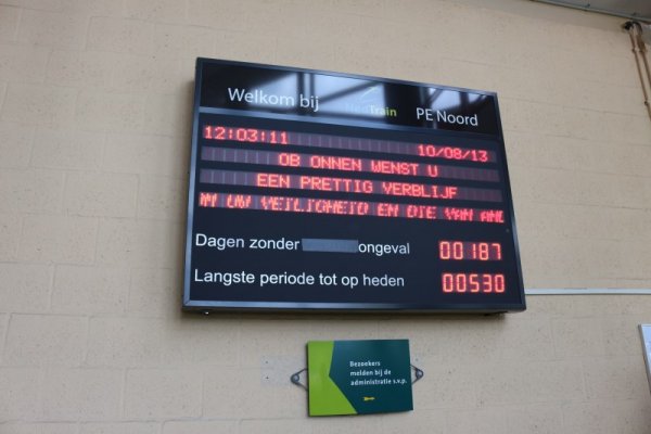 Bij de binnenkomst van de werkplaats, via het kantorencomplex viel ons deze lichtkrant op. Op dit bord staat naast een prettige en veilige toewensing voor ons bezoek ook vermeld hoeveel dagen er zonder ongeval binnen het bedrijf is gewerkt. Dit betreft bedrijfsongevallen. Een geschaafde vinger valt hier niet onder. Ook de langste tijd staat er netjes op vermeld. Zo kunnen bezoekers en werknemers goede transparantie zien in de veiligheidseisen die NedTrain hanteert aan het werken aan materieel en hoe de arbeidsomstandigheden worden uitgevoerd.