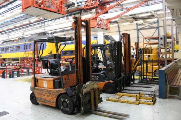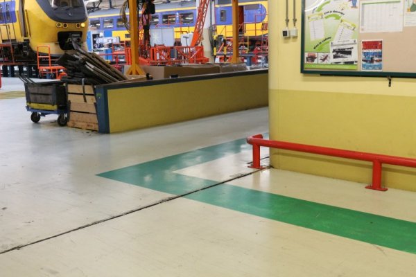 De veiligheidseisen binnen NedTrain zijn zo strikt dat personeel voor hun eigen veiligheid op de groene banen moeten lopen. In deze straat binnen de werkplaats rijden namelijk soms heftrucks rond met onderdelen.