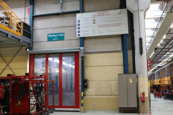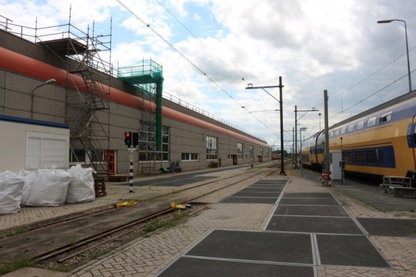 Hier zien we nog een putspoor in een afgeschermde loods waar op dit moment de SGM-treinstellen werden voorzien van magneetremmen. Voor deze ingreep werd deze loods gebruikt, die voorheen gebruikt werd voor het inbouwen van airco-apparatuur in de machinistencabine van de VIRM. Met regelmaat wordt deze loods wel eens gebruikt voor proeven met de air-conditioning. Dit omdat de ruimte gesloten is en daarbij de warmte of kou binnen kan worden gehouden. Ons rest alleen nog de vraag wie Wiebe is, en wat voor rol hij hier had.