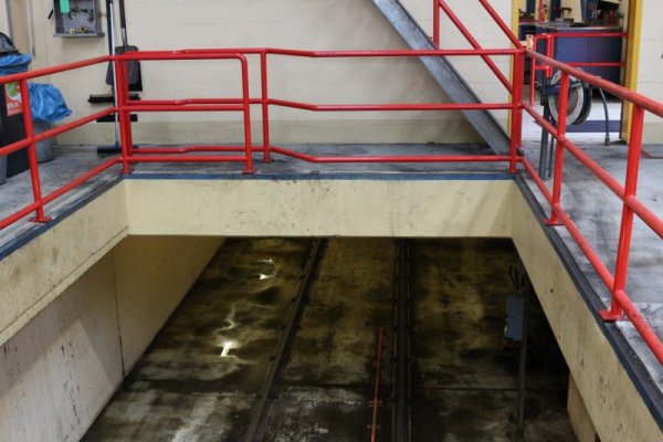 Hier zijn we de trein boven op het putspoor. Dit deel van de rails kan in de breedte los van elkaar af worden bewogen, waarmee een wielstel vrij van het spoor kan worden gehouden.
