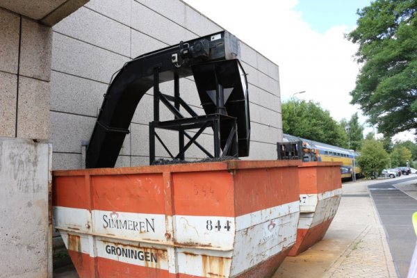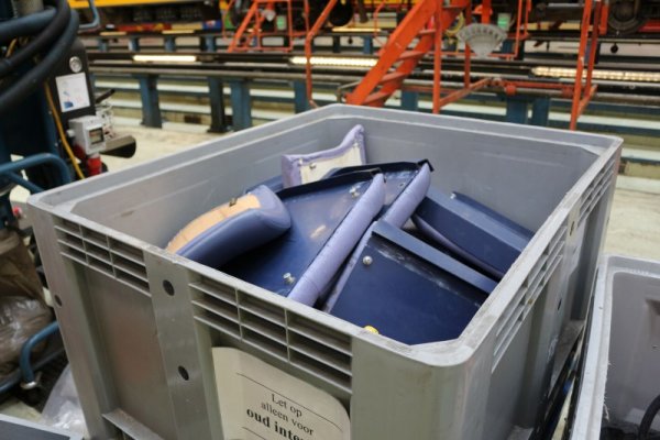 In deze container komt het slijpsel van de wielen vandaan van de kuilwielenbank. Dit metaal is flinterdun afgeslepen en mag onder geen beding met de hand worden aangeraakt. Met regelmaat worden de containers uiteindelijk door een gespecialiseerd bedrijf geleegd, en worden de metalen delen geer gerecycled. Ook recyclen is een hoge vaandel in de werkzaamheden wat NedTrain uitvoert. In 2018 verwachten ze 80% van de onnodige onderdelen te recyclen.