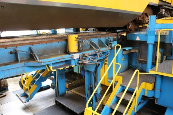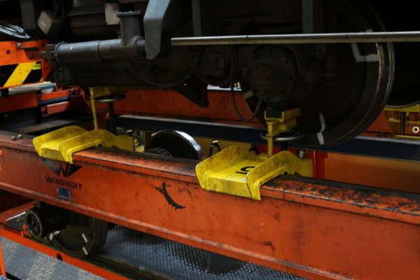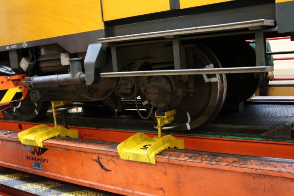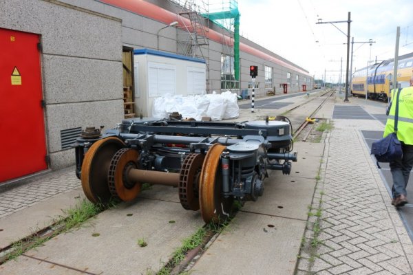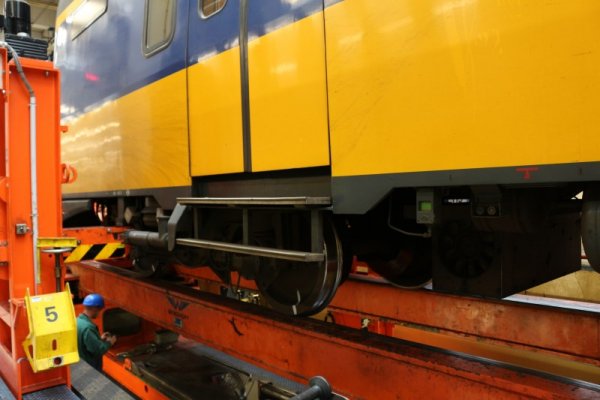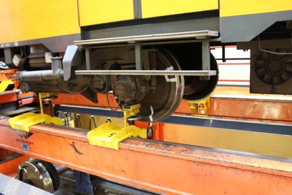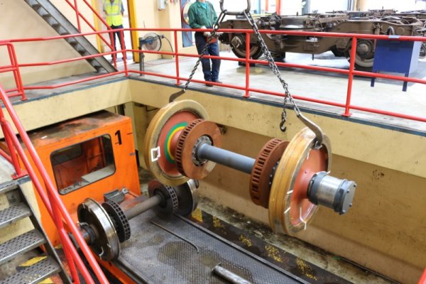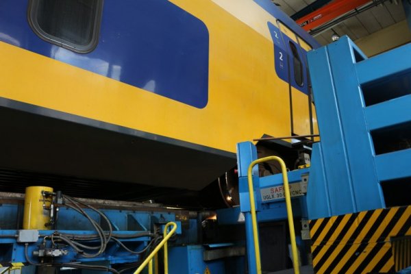 Hier zien we dat de wielassen worden opgetakeld, waarna een nieuwe as terug op transport zal gaan, waarna deze weer vervolgens onder de trein wordt gemonteerd.