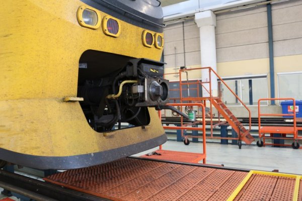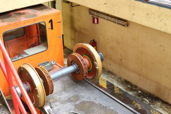 Hier zien we dat het wielstel volledig los staat van het spoor, en op speciale hef-bokken is geplaatst. Dit gebeurt door een onderhouds-medewerker. Vanaf dit moment kan in dit geval de as los worden gemaakt, waarna deze naar de kelder wordt afgevoerd. het afvoeren gebeurt via een ondergronds treintje die naar de wielenwerkplaats- en magazijn rijdt.