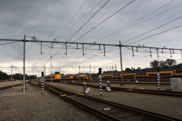 Hier zien we een ICM-trein en een VIRM-dubbeldekstrein in onderhoud. De VIRM-trein kreeg op moment van ons bezoek een stel nieuwe onderdelen voor de airconditioning en een algehele controlebeurt. Op de voorgrond zien we het hoogwerkers-bordes die we in de vorige foto al hadden beschreven.