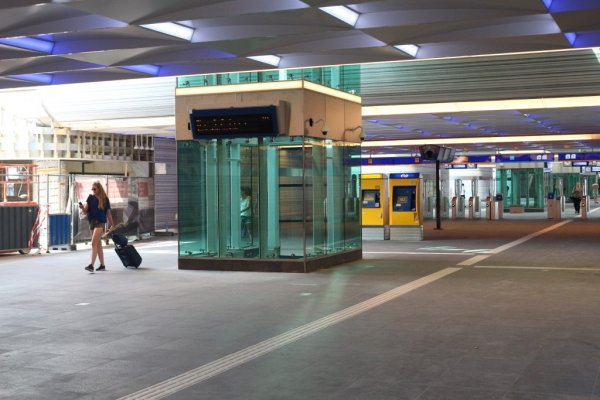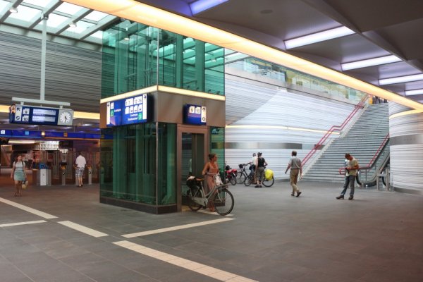 Midden in de tunnel onder de perrons zijn mooie glazen liftschachten aangelegd, zodat mensen met veel bagage of met een fiets ook naar het perron of de stationshal kunnen.