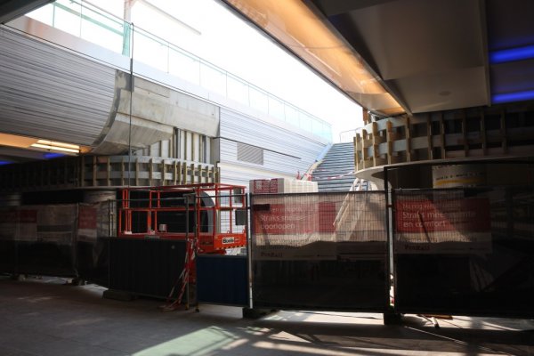 De oude en tijdelijke reizigerstraverse die 5 jaar lang dienst heeft gedaan om de reizigers naar de perrons te brengen tijdens de werkzaamheden. Op dit moment is deze al weer afgebroken.