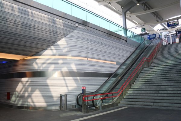 Vanuit deze hoek zien we de roltrappen en de reguliere trap naar het perron. Er is per zijde van de tunnel één roltrap die elk naar boven of naar beneden gaat.