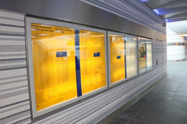 De gele vertrekstaten zijn ook hier in de tunnel aanwezig. Er is bij de Nederlandse Spoorwegen nog geen reden om deze borden definitief van de stations te verwijderen.