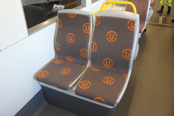 • Het stoelmotief. Er waren drie soorten stoel-motieven te zien, waaronder een voorzien van het logo van U-OV, een met een krachtige drukke oranje golfbeweging op de stof, en een matte grijze stoelzitting. Uit onze keuze kwam het logo naar voren omdat deze vrij rustig oogt.