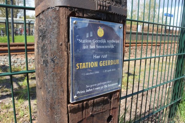 Op een door hen ingegraven spoorbiels staat de tekst 'Station Geerdijk verdwijnt uit het Smoezenrijk. Hier rust station Geerdijk. 1 oktober 1906 - 29 april 2016. Ten grave gedragen door Prins John I van CV De Smoezen.'